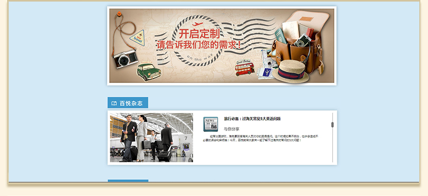 Project Description 百悦逸游于2012年初由二位资深的旅行家创办,是成都传媒集团旗下成都新闻国际旅行社有限公司的高端旅游品牌,总部位于成都高新区天府大道中段美年广场。在百悦逸游成立之前,创始团队亲自到全球三十多个国家实地考察,带着第一手的资讯和执着的信念创立了中国西部第一家真正意义上的私人定制旅行机构。百悦的旅行不是跟团挤大巴,不是十天去十个国家,更不是没完没了的... Official website address 潜江http://www.100.travel I want to share